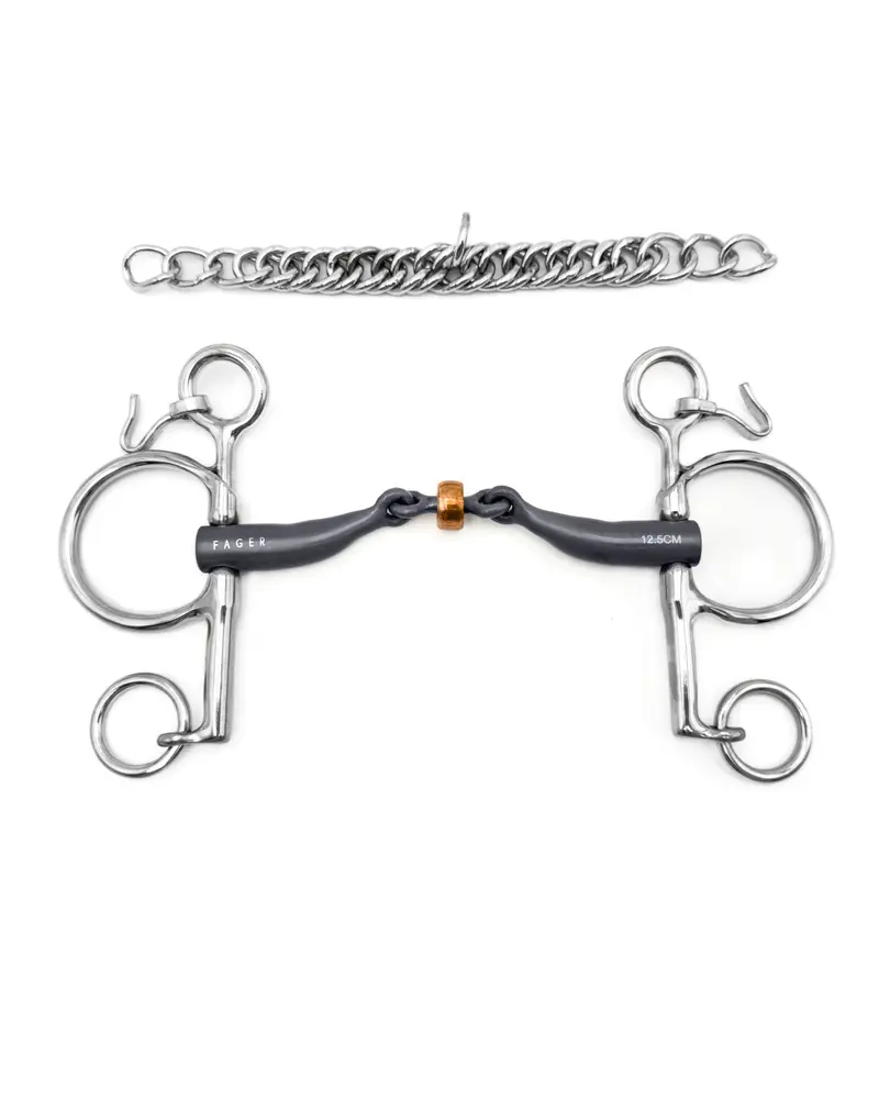 Sally's double-jointed mouthpiece has a tongue relief, relieving constant pressure. This bit is a good option for horses that can get strong in the contact, lean on the bit where you want a lighter and softer contact in the hand, and have a faster response when you take the reins. Together with the Kimblehook sidepiece, you get a stable, framed feeling with more brakes.